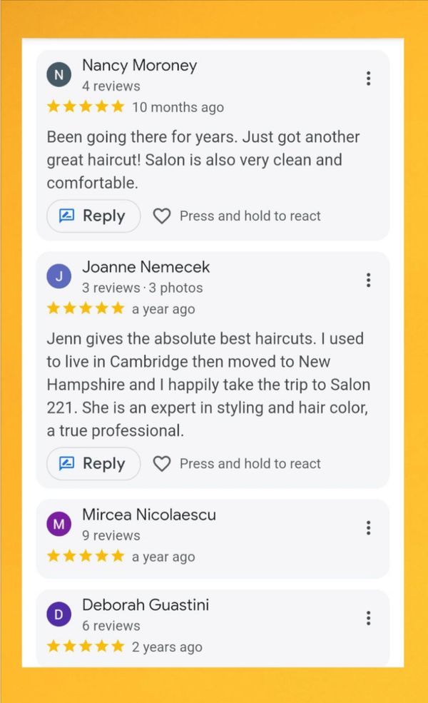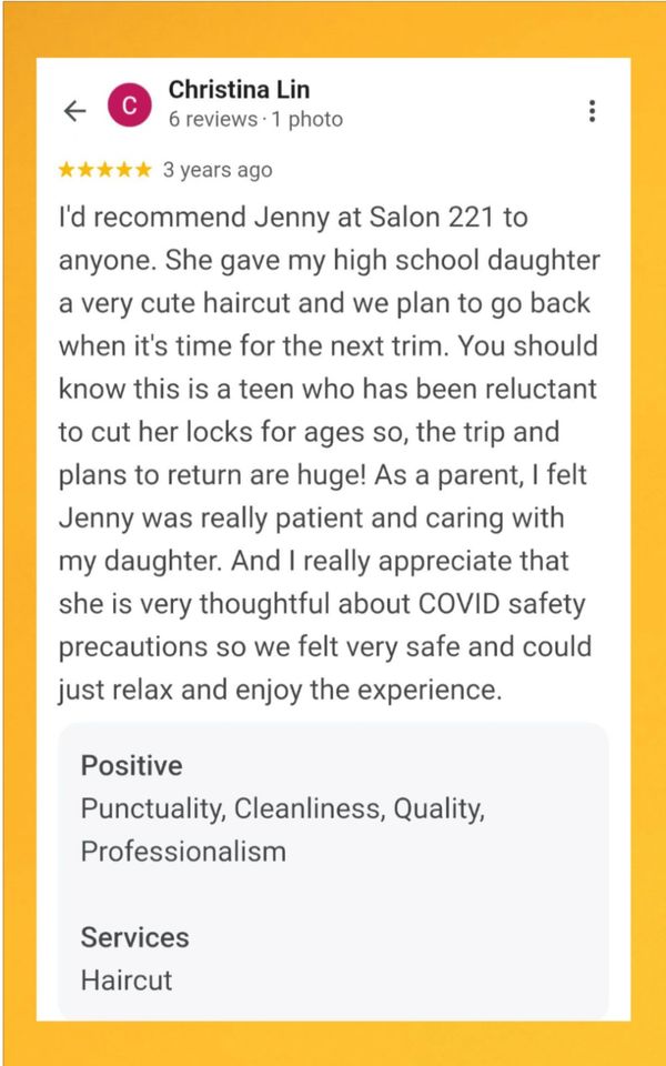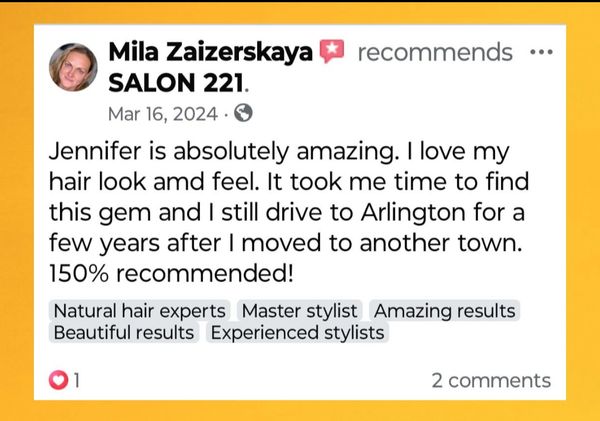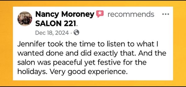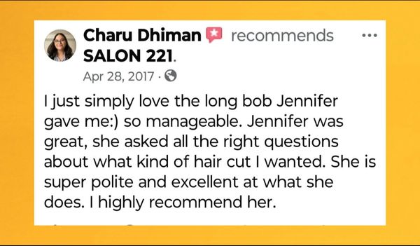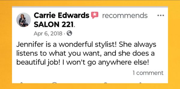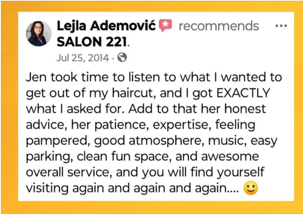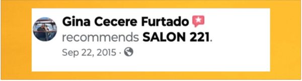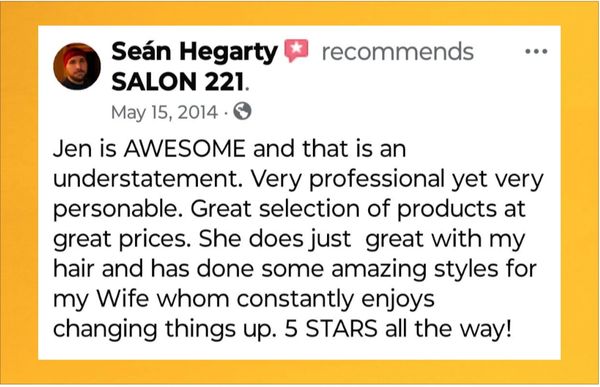 Salon 221 is interdependently owned and operated by a solo artist providing one to one appointments, offering a more personalized service experience without double booking clients together all day, focused on work performed behind the chair and customer service where clients are taken on time & leave on time .