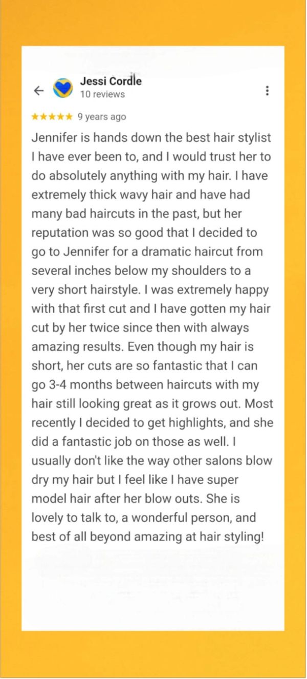 Jennifer has 22 years experience and is a talented stylist and crochet artist who is creative, compassionate, polite, kind, professional, approachable, relatable, trustworthy,