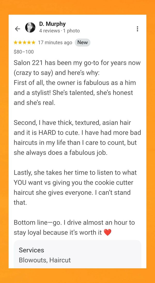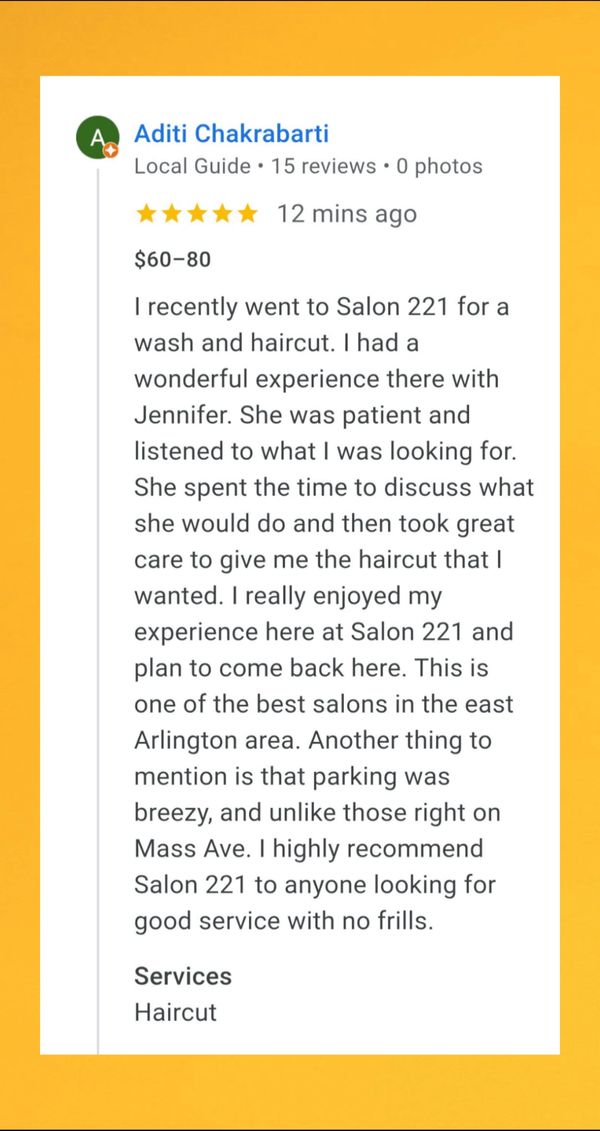 Salon 221 is a unisex salon, the atmosphere is unpretentious, comfortable, upbeat, casual and relaxing, offering a safe space for all and compassionate services.